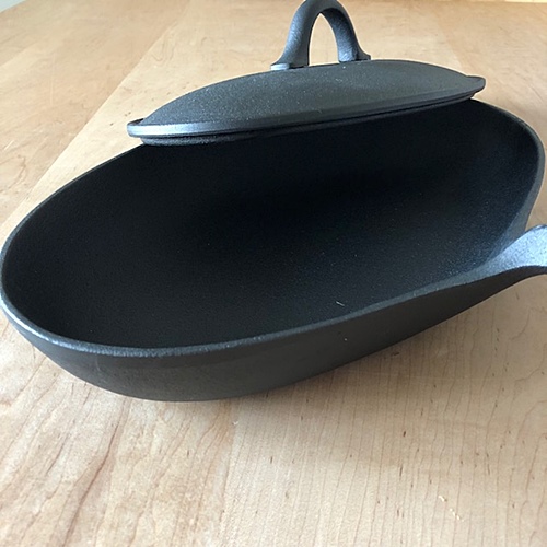 このフィッシュパンが違うところは、鉄製。しかも南部鉄器の鋳物で分厚く作ってることです。この素材感なら、何を焼くにしてもよく火が通る。温度が一定するので焦げにくい。