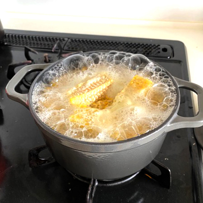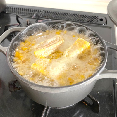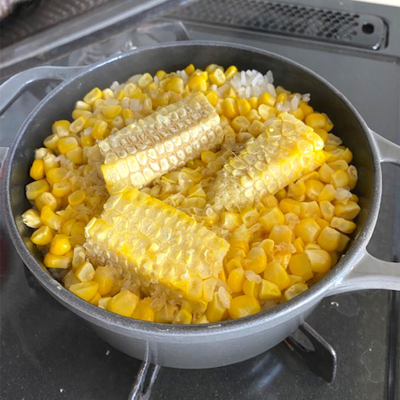 とうもろこし1個分を削いで、芯もそのままイン。まずは蓋をして5分くらい火にかけます。