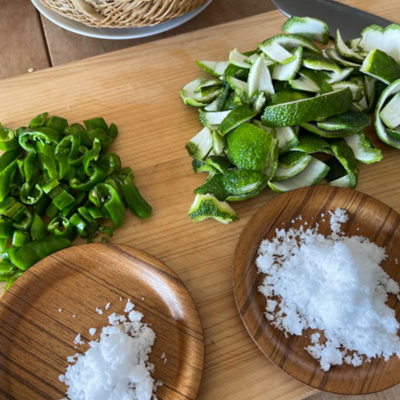 柚子の皮と塩でかけて、青唐辛子と塩でかける。別々に。