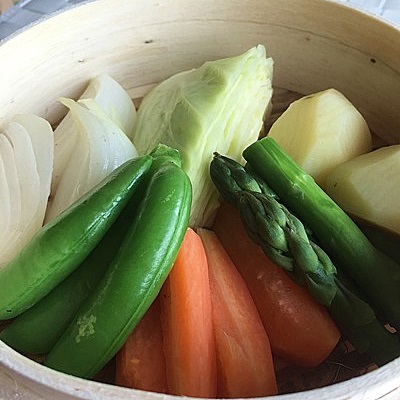 10分ほどしてからキャベツ、玉ネギを入れ、さらに5分ほどしてスナップえんどうとアスパラを入れています。そうするとちょうど同じ時間に蒸しあがります。大きさにもよりますが、全体で20分くらいです。